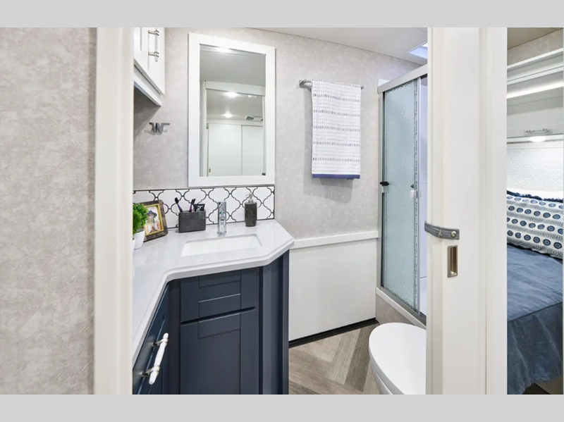 Sleeps 5 Slides 2 Length 35 ft 6 in Ext Width 8 ft 6 in Ext Height 12 ft 1 in Int Height 6 ft 10 in Interior Color Organic Comfort Dark, Organic Comfort Light, Bohemian Oasis Exterior Color Full-Body Paint; Silvermist, Wedgewood ll, Steel Grey, Night Sky Hitch Weight 5000 lbs GVWR 22000 lbs Fresh Water Capacity 75 gals Grey Water Capacity 57 gals Black Water Capacity 48 gals Tire Size 22.5" Furnace BTU 40000 btu Generator 5,500-Watt Cummins Onan Marquis Gold Fuel Type Gas Engine 7.3L V8 Chassis Ford F-53 Fuel Capacity 80 gals Wheelbase 228 in Available Beds King Refrigerator Type Stainless Steel Residential with Ice Maker and Water Dispenser Convection Cooking Yes Cooktop Burners 2 Shower Size 34" x 34" Number of Awnings 1 Axle Weight Front 8000 lbs Axle Weight Rear 15000 lbs LP Tank Capacity 76.14 lbs Water Heater Capacity 10 gal Water Heater Type 110V/LP AC BTU 28500 btu Basement Storage 122 cu. ft. TV Info LR 50" HDTV, BR 32" HDTV, Ext. 32" HDTV Awning Info 19' Power w/LED Lighting Washer/Dryer Available Yes Gross Combined Weight 26000 lbs Shower Type Radius Electrical Service 50 amp Similar Floorplans