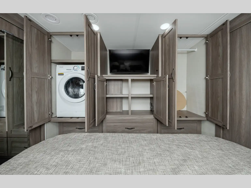 Sleeps 5 Slides 2 Length 35 ft 10 in Ext Width 8 ft 6 in Ext Height 12 ft 1 in Int Height 6 ft 10 in Interior Color Organic Comfort Dark, Organic Comfort Light, Bohemian Oasis Exterior Color Full-Body Paint; Silvermist, Wedgewood ll, Steel Grey, Night Sky Hitch Weight 5000 lbs GVWR 22000 lbs Fresh Water Capacity 74 gals Grey Water Capacity 51 gals Black Water Capacity 63 gals Tire Size 22.5" Furnace BTU 40000 btu Generator 5,500-Watt Cummins Onan Marquis Gold Fuel Type Gas Engine 7.3L V8 Chassis Ford F53 Fuel Capacity 80 gals Wheelbase 228 in Available Beds King Refrigerator Type Stainless Steel Residential with Ice Maker and Water Dispenser Convection Cooking Yes Cooktop Burners 3 Shower Size 36" x 36" Number of Awnings 1 Axle Weight Front 8000 lbs Axle Weight Rear 15000 lbs LP Tank Capacity 76.14 lbs Water Heater Capacity 10 gal Water Heater Type 110V/LP AC BTU 28500 btu Basement Storage 137 cu. ft. TV Info LR 39" HDTV, BR 32" HDTV, Ext. 32" HDTV Awning Info 16' Power w/LED Lighting Washer/Dryer Available Yes Gross Combined Weight 26000 lbs Shower Type Standard Electrical Service 50 amp Similar Floorplans